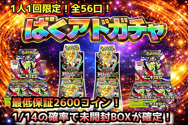 全てポケモンBOXドラゴンボール遊戯王ワンピースホビーその他コラボニブイチ ラインナップ(一部)詳細11111111 無料/1回 1回ガチャ ラインナップ(一部)詳細25 39/1回 残7033 / 7975 1回ガチャ 10連ガチャ 100連ガチャ ラインナップ(一部)詳細25 50/1回 残3689 / 7975 1回ガチャ 10連ガチャ 100連ガチャ ラインナップ(一部)詳細2222222222262755 97/1回 残19949 / 20735 1回ガチャ 10連ガチャ 100連ガチャ ラインナップ(一部)詳細233113333333 80/1回 残11934 / 12760 1回ガチャ 10連ガチャ 100連ガチャ ラインナップ(一部)詳細52080 390/1回 残6702 / 7000 1回ガチャ 10連ガチャ 100連ガチャ ラインナップ(一部)詳細32770 61/1回 残13585 / 14440 1回ガチャ 10連ガチャ 100連ガチャ ラインナップ(一部)詳細5520 10/1回 残475 / 9570 1回ガチャ 10連ガチャ 100連ガチャ ラインナップ(一部)詳細2366 17/1回 残14795 / 16983 1回ガチャ 10連ガチャ 100連ガチャ ラインナップ(一部)詳細25551020 170/1回 残56515 / 59995 1回ガチャ 10連ガチャ 100連ガチャ ラインナップ(一部)詳細50100150450 499/1回 残1139 / 1500 1回ガチャ 10連ガチャ 100連ガチャ ラインナップ(一部)詳細22396 2100/1回 残736 / 800 1回ガチャ 10連ガチャ 100連ガチャ ラインナップ(一部)詳細1111111111111111111180 289/1回 残96596 / 100000 1回ガチャ 10連ガチャ 100連ガチャ ラインナップ(一部)詳細225555555556 66/1回 残28994 / 31900 1回ガチャ 10連ガチャ 100連ガチャ 2026-03-15 23:59:59まで ラインナップ(一部)詳細7 8/1回 残55098 / 57344 1回ガチャ 10連ガチャ 100連ガチャ 2026-03-15 23:59:59まで ラインナップ(一部)詳細7 10/1回 残56437 / 57344 1回ガチャ 10連ガチャ 100連ガチャ ラインナップ(一部)詳細525 590/1回 残13836 / 19800 1回ガチャ 10連ガチャ 100連ガチャ ラインナップ(一部)詳細10 194/1回 残1657 / 3190 1回ガチャ 10連ガチャ 100連ガチャ ラインナップ(一部)詳細10 7/1回 残67212 / 81920 1回ガチャ 10連ガチャ 100連ガチャ 2026-03-31 23:59:59まで ラインナップ(一部)詳細11101010 1502/1回 残199 / 320 1回ガチャ 10連ガチャ 100連ガチャ 2026-03-31 23:59:59まで ラインナップ(一部)詳細50 2363/1回 残228 / 250 1回ガチャ 10連ガチャ 100連ガチャ 2026-03-09 23:59:59まで 8900/1回 本ガチャは終了しました 2026-03-09 23:59:59まで 274/1回 本ガチャは終了しました 4880/1回 本ガチャは終了しました 2026-03-01 23:59:59まで 2380/1回 本ガチャは終了しました 2026-02-23 23:59:59まで 1750/1回 本ガチャは終了しました 2026-02-27 23:59:59まで 4800/1回 本ガチャは終了しました 5/1回 本ガチャは終了しました 88/1回 本ガチャは終了しました 80/1回 本ガチャは終了しました 83/1回 本ガチャは終了しました 2026-02-28 23:59:59まで 17/1回 本ガチャは終了しました 2026-02-28 23:59:59まで 4800/1回 本ガチャは終了しました 2026-03-08 23:59:59まで 8999/1回 本ガチャは終了しました 2026-03-08 23:59:59まで 4000/1回 本ガチャは終了しました 2026-02-28 23:59:59まで 2363/1回 本ガチャは終了しました 2026-02-28 23:59:59まで 2363/1回 本ガチャは終了しました 100/1回 本ガチャは終了しました 無料/1回 本ガチャは終了しました 2026-02-17 23:59:59まで 500/1回 本ガチャは終了しました 2026-02-05 23:59:59まで 1300/1回 本ガチャは終了しました 600/1回 本ガチャは終了しました 2026-02-09 23:59:59まで 205/1回 本ガチャは終了しました 2026-02-09 23:59:59まで 890/1回 本ガチャは終了しました 2026-01-27 23:59:59まで 6500/1回 本ガチャは終了しました 2026-02-01 23:59:59まで 5400/1回 本ガチャは終了しました 2026-02-01 23:59:59まで 33/1回 本ガチャは終了しました 2026-01-26 23:59:59まで 777/1回 本ガチャは終了しました 2026-01-31 23:59:59まで 無料/1回 本ガチャは終了しました 2026-02-01 23:59:59まで 52/1回 本ガチャは終了しました 2026-01-17 23:59:59まで 3000/1回 本ガチャは終了しました 2026-01-25 23:59:59まで 131/1回 本ガチャは終了しました 2026-02-01 23:59:59まで 119/1回 本ガチャは終了しました 700/1回 本ガチャは終了しました 1000/1回 本ガチャは終了しました 5400/1回 本ガチャは終了しました 2026-01-25 23:59:59まで 110/1回 本ガチャは終了しました 2026-01-25 23:59:59まで 46/1回 本ガチャは終了しました 2026-01-05 23:59:59まで 65/1回 本ガチャは終了しました 2026-01-05 23:59:59まで 無料/1回 本ガチャは終了しました 2026-01-05 23:59:59まで 無料/1回 本ガチャは終了しました 2026-01-05 23:59:59まで 38/1回 本ガチャは終了しました 2025-12-31 23:59:59まで 76/1回 本ガチャは終了しました