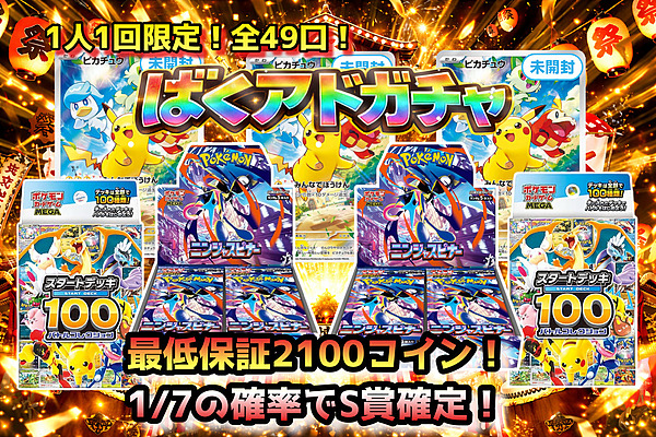 全てポケモンBOXドラゴンボール遊戯王ワンピースホビーその他コラボ 1人1回制限ラインナップ(一部)詳細232 2000/1回 残12 / 49 1回ガチャ 1日3000回制限2026-04-09 23:59:59までラインナップ(一部)詳細105105552020 9/1回 残42149 / 71200 1回ガチャ 10連ガチャ 100連ガチャ ラインナップ(一部)詳細40 80/1回 残12432 / 12760 1回ガチャ 10連ガチャ 100連ガチャ ラインナップ(一部)詳細255101010 210/1回 残57663 / 59995 1回ガチャ 10連ガチャ 100連ガチャ 1日1回制限2026-04-30 23:59:59までラインナップ(一部)詳細11111111 無料/1回 1回ガチャ 1人1回制限2026-04-30 23:59:59までラインナップ(一部)詳細111111133333333 100/1回 1回ガチャ ラインナップ(一部)詳細222222222222222222 6/1回 残256008 / 299492 1回ガチャ 10連ガチャ 100連ガチャ 1日1000回制限ラインナップ(一部)詳細50 57/1回 残9827 / 15950 1回ガチャ 10連ガチャ 100連ガチャ ラインナップ(一部)詳細122333333333331033331010 299/1回 残90670 / 100000 1回ガチャ 10連ガチャ 100連ガチャ ラインナップ(一部)詳細40 49/1回 残1950 / 12760 1回ガチャ 10連ガチャ 100連ガチャ ラインナップ(一部)詳細20 44/1回 残3507 / 6380 1回ガチャ 10連ガチャ 100連ガチャ ラインナップ(一部)詳細25 50/1回 残1934 / 7975 1回ガチャ 10連ガチャ 100連ガチャ ラインナップ(一部)詳細25 50/1回 残5930 / 7975 1回ガチャ 10連ガチャ 100連ガチャ ラインナップ(一部)詳細20 42/1回 残3106 / 6380 1回ガチャ 10連ガチャ 100連ガチャ ラインナップ(一部)詳細22666666 37/1回 残12342 / 12760 1回ガチャ 10連ガチャ 100連ガチャ ラインナップ(一部)詳細2222333355555 33/1回 残41561 / 44955 1回ガチャ 10連ガチャ 100連ガチャ ラインナップ(一部)詳細25 39/1回 残5827 / 7975 1回ガチャ 10連ガチャ 100連ガチャ 1人1000回制限ラインナップ(一部)詳細32770 61/1回 残12273 / 14440 1回ガチャ 10連ガチャ 100連ガチャ ラインナップ(一部)詳細2222222222262755 97/1回 残15811 / 20735 1回ガチャ 10連ガチャ 100連ガチャ ラインナップ(一部)詳細225555555556 66/1回 残28841 / 31900 1回ガチャ 10連ガチャ 100連ガチャ ラインナップ(一部)詳細233113333333 80/1回 残8125 / 12760 1回ガチャ 10連ガチャ 100連ガチャ ラインナップ(一部)詳細50100150450 499/1回 残1081 / 1500 1回ガチャ 10連ガチャ 100連ガチャ ラインナップ(一部)詳細22396 2100/1回 残686 / 800 1回ガチャ 10連ガチャ 100連ガチャ ラインナップ(一部)詳細2366 17/1回 残6282 / 16983 1回ガチャ 10連ガチャ 100連ガチャ ラインナップ(一部)詳細10 194/1回 残1471 / 3190 1回ガチャ 10連ガチャ 100連ガチャ ラインナップ(一部)詳細10 7/1回 残55097 / 81920 1回ガチャ 10連ガチャ 100連ガチャ 1人1回制限2026-04-09 23:59:59まで 500/1回 本ガチャは終了しました 1日1回制限1人1回制限 300/1回 本ガチャは終了しました 1人2000回制限 10/1回 本ガチャは終了しました 2026-03-09 23:59:59まで 274/1回 本ガチャは終了しました 1日1回制限1人1回制限 4880/1回 本ガチャは終了しました 1人1回制限2026-03-01 23:59:59まで 2380/1回 本ガチャは終了しました 2026-03-31 23:59:59まで 390/1回 本ガチャは終了しました 1人1000回制限 10/1回 本ガチャは終了しました 1日1回制限1人1回制限2026-02-23 23:59:59まで 1750/1回 本ガチャは終了しました 1人1回制限2026-02-27 23:59:59まで 4800/1回 本ガチャは終了しました 88/1回 本ガチャは終了しました 5/1回 本ガチャは終了しました 80/1回 本ガチャは終了しました 2026-03-31 23:59:59まで 170/1回 本ガチャは終了しました 83/1回 本ガチャは終了しました 2026-03-31 23:59:59まで 289/1回 本ガチャは終了しました 2026-03-15 23:59:59まで 8/1回 本ガチャは終了しました 2026-03-15 23:59:59まで 10/1回 本ガチャは終了しました 2026-02-28 23:59:59まで 17/1回 本ガチャは終了しました 2026-03-31 23:59:59まで 590/1回 本ガチャは終了しました 2026-02-28 23:59:59まで 4800/1回 本ガチャは終了しました 1日5回制限2026-03-08 23:59:59まで 8999/1回 本ガチャは終了しました 2026-03-08 23:59:59まで 4000/1回 本ガチャは終了しました 1日1回制限1人1回制限2026-03-20 23:59:59まで 1000/1回 本ガチャは終了しました 2026-02-28 23:59:59まで 2363/1回 本ガチャは終了しました 2026-02-28 23:59:59まで 2363/1回 本ガチャは終了しました 2026-03-31 23:59:59まで 2363/1回 本ガチャは終了しました 1人1回制限 100/1回 本ガチャは終了しました 1日1回制限 無料/1回 本ガチャは終了しました 1人1回制限2026-02-17 23:59:59まで 500/1回 本ガチャは終了しました 1人1回制限2026-02-05 23:59:59まで 1300/1回 本ガチャは終了しました 600/1回 本ガチャは終了しました 2026-02-09 23:59:59まで 205/1回 本ガチャは終了しました 1人1回制限2026-02-09 23:59:59まで 890/1回 本ガチャは終了しました 1日1回制限1人1回制限2026-03-09 23:59:59まで 8900/1回 本ガチャは終了しました 39/1回 本ガチャは終了しました 1日1回制限1人1回制限2026-03-16 23:59:59まで 1000/1回 本ガチャは終了しました 1日1回制限1人1回制限2026-01-27 23:59:59まで 6500/1回 本ガチャは終了しました 39/1回 本ガチャは終了しました 1日1回制限1人1回制限2026-03-13 23:59:59まで 2500/1回 本ガチャは終了しました 1人2000回制限 10/1回 本ガチャは終了しました 40/1回 本ガチャは終了しました 1人1回制限2026-03-23 23:59:59まで 500/1回 本ガチャは終了しました 1人