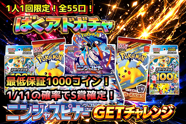 全てポケモンBOXドラゴンボール遊戯王ワンピースホビーその他コラボ 1人1回制限2026-03-31 23:59:59までラインナップ(一部)詳細111111133333333 100/1回 1回ガチャ 1日1回制限2026-03-31 23:59:59までラインナップ(一部)詳細11111111 無料/1回 1回ガチャ ラインナップ(一部)詳細122333333333331033331010 299/1回 残97192 / 100000 1回ガチャ 10連ガチャ 100連ガチャ 1日1000回制限ラインナップ(一部)詳細50 57/1回 残12326 / 15950 1回ガチャ 10連ガチャ 100連ガチャ ラインナップ(一部)詳細25 50/1回 残6735 / 7975 1回ガチャ 10連ガチャ 100連ガチャ ラインナップ(一部)詳細25 50/1回 残2057 / 7975 1回ガチャ 10連ガチャ 100連ガチャ 1人2000回制限ラインナップ(一部)詳細5205 10/1回 残2586 / 9570 1回ガチャ 10連ガチャ 100連ガチャ ラインナップ(一部)詳細20 44/1回 残4786 / 6380 1回ガチャ 10連ガチャ 100連ガチャ ラインナップ(一部)詳細20 42/1回 残4380 / 6380 1回ガチャ 10連ガチャ 100連ガチャ ラインナップ(一部)詳細222222222222222222 6/1回 残281110 / 299492 1回ガチャ 10連ガチャ 100連ガチャ ラインナップ(一部)詳細2222333355555 33/1回 残41570 / 44955 1回ガチャ 10連ガチャ 100連ガチャ ラインナップ(一部)詳細25 39/1回 残5957 / 7975 1回ガチャ 10連ガチャ 100連ガチャ ラインナップ(一部)詳細2222222222262755 97/1回 残18646 / 20735 1回ガチャ 10連ガチャ 100連ガチャ ラインナップ(一部)詳細233113333333 80/1回 残9110 / 12760 1回ガチャ 10連ガチャ 100連ガチャ 2026-03-31 23:59:59までラインナップ(一部)詳細52080 390/1回 残6422 / 7000 1回ガチャ 10連ガチャ 100連ガチャ 1人1000回制限ラインナップ(一部)詳細32770 61/1回 残12333 / 14440 1回ガチャ 10連ガチャ 100連ガチャ ラインナップ(一部)詳細2366 17/1回 残6389 / 16983 1回ガチャ 10連ガチャ 100連ガチャ 2026-03-31 23:59:59までラインナップ(一部)詳細25551020 170/1回 残56293 / 59995 1回ガチャ 10連ガチャ 100連ガチャ ラインナップ(一部)詳細50100150450 499/1回 残1109 / 1500 1回ガチャ 10連ガチャ 100連ガチャ ラインナップ(一部)詳細22396 2100/1回 残704 / 800 1回ガチャ 10連ガチャ 100連ガチャ 2026-03-31 23:59:59までラインナップ(一部)詳細1111111111111111111180 289/1回 残91734 / 100000 1回ガチャ 10連ガチャ 100連ガチャ ラインナップ(一部)詳細225555555556 66/1回 残28843 / 31900 1回ガチャ 10連ガチャ 100連ガチャ 2026-03-31 23:59:59までラインナップ(一部)詳細525 590/1回 残13484 / 19800 1回ガチャ 10連ガチャ 100連ガチャ ラインナップ(一部)詳細10 194/1回 残1646 / 3190 1回ガチャ 10連ガチャ 100連ガチャ ラインナップ(一部)詳細10 7/1回 残55154 / 81920 1回ガチャ 10連ガチャ 100連ガチャ 2026-03-31 23:59:59までラインナップ(一部)詳細11101010 1502/1回 残199 / 320 1回ガチャ 10連ガチャ 100連ガチャ 2026-03-31 23:59:59までラインナップ(一部)詳細50 2363/1回 残224 / 250 1回ガチャ 10連ガチャ 100連ガチャ 1人1回制限2026-03-27 23:59:59まで 700/1回 本ガチャは終了しました 1人1回制限2026-03-23 23:59:59まで 500/1回 本ガチャは終了しました 1日1回制限1人1回制限2026-03-20 23:59:59まで 1000/1回 本ガチャは終了しました 1日1回制限1人1回制限2026-03-16 23:59:59まで 1000/1回 本ガチャは終了しました 40/1回 本ガチャは終了しました 39/1回 本ガチャは終了しました 39/1回 本ガチャは終了しました 1日1回制限1人1回制限2026-03-13 23:59:59まで 2500/1回 本ガチャは終了しました 1人2000回制限 10/1回 本ガチャは終了しました 1日1回制限1人1回制限2026-03-09 23:59:59まで 8900/1回 本ガチャは終了しました 2026-03-09 23:59:59まで 274/1回 本ガチャは終了しました 1日1回制限1人1回制限 4880/1回 本ガチャは終了しました 1人1回制限2026-03-01 23:59:59まで 2380/1回 本ガチャは終了しました 1人1000回制限 10/1回 本ガチャは終了しました 1日1回制限1人1回制限2026-02-23 23:59:59まで 1750/1回 本ガチャは終了しました 1人1回制限2026-02-27 23:59:59まで 4800/1回 本ガチャは終了しました 5/1回 本ガチャは終了しました 88/1回 本ガチャは終了しました 80/1回 本ガチャは終了しました 83/1回 本ガチャは終了しました 2026-03-15 23:59:59まで 8/1回 本ガチャは終了しました 2026-03-15 23:59:59まで 10/1回 本ガチャは終了しました 2026-02-28 23:59:59まで 17/1回 本ガチャは終了しました 2026-02-28 23:59:59まで 4800/1回 本ガチャは終了しました 1日5回制限2026-03-08 23:59:59まで 8999/1回 本ガチャは終了しました 2026-03-08 23:59:59まで 4000/1回 本ガチャは終了しました 2026-02-28 23:59:59まで 2363/1回 本ガチャは終了しました 2026-02-28 23:59:59まで 2363/1回 本ガチャは終了しました 1人1回制限 100/1回 本ガチャは終了しました 1日1回制限 無料/1回 本ガチャは終了しました 1人1回制限2026-02-17 23:59:59まで 500/1回 本ガチャは終了しました 1人1回制限2026-02-05 23:59:59まで 1300/1回 本ガチャは終了しました 600/1回 本ガチャは終了しました 2026-02-09 23:59:59まで 205/1回 本ガチャは終了しました 1人1回制限2026-02-09 23:59:59まで 890/1回 本ガチャは終了しました 1日1回制限1人1回制限2026-01-27 23:59:59まで 6500/1回 本ガチャは終了しました 1日1回制限1人1回制限2026-02-01 23:59:59まで 5400/1回 本ガチャは終了しました 2026-02-01 23:59:59まで 33/1回 本ガチャは終了しました 1人1回制限2026-01-26 23:59:59まで 777/1回 本