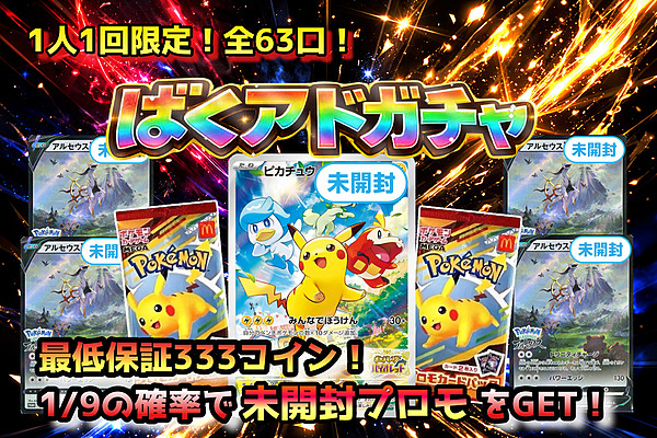 全てポケモンBOXドラゴンボール遊戯王ワンピースホビーその他コラボ ラインナップ(一部)詳細40 80/1回 残12760 / 12760 1回ガチャ 10連ガチャ 100連ガチャ ラインナップ(一部)詳細255101010 210/1回 残58119 / 59995 1回ガチャ 10連ガチャ 100連ガチャ 1日1回制限2026-04-30 23:59:59までラインナップ(一部)詳細11111111 無料/1回 1回ガチャ 1人1回制限2026-04-30 23:59:59までラインナップ(一部)詳細111111133333333 100/1回 1回ガチャ ラインナップ(一部)詳細222222222222222222 6/1回 残256827 / 299492 1回ガチャ 10連ガチャ 100連ガチャ 1日1000回制限ラインナップ(一部)詳細50 57/1回 残11000 / 15950 1回ガチャ 10連ガチャ 100連ガチャ ラインナップ(一部)詳細122333333333331033331010 299/1回 残90935 / 100000 1回ガチャ 10連ガチャ 100連ガチャ ラインナップ(一部)詳細40 49/1回 残4336 / 12760 1回ガチャ 10連ガチャ 100連ガチャ ラインナップ(一部)詳細20 44/1回 残3651 / 6380 1回ガチャ 10連ガチャ 100連ガチャ ラインナップ(一部)詳細25 50/1回 残1935 / 7975 1回ガチャ 10連ガチャ 100連ガチャ ラインナップ(一部)詳細25 50/1回 残5931 / 7975 1回ガチャ 10連ガチャ 100連ガチャ ラインナップ(一部)詳細20 42/1回 残3107 / 6380 1回ガチャ 10連ガチャ 100連ガチャ ラインナップ(一部)詳細22666666 37/1回 残12747 / 12760 1回ガチャ 10連ガチャ 100連ガチャ ラインナップ(一部)詳細2222333355555 33/1回 残41564 / 44955 1回ガチャ 10連ガチャ 100連ガチャ ラインナップ(一部)詳細25 39/1回 残5838 / 7975 1回ガチャ 10連ガチャ 100連ガチャ 1人1000回制限ラインナップ(一部)詳細32770 61/1回 残12298 / 14440 1回ガチャ 10連ガチャ 100連ガチャ ラインナップ(一部)詳細2222222222262755 97/1回 残15812 / 20735 1回ガチャ 10連ガチャ 100連ガチャ ラインナップ(一部)詳細225555555556 66/1回 残28841 / 31900 1回ガチャ 10連ガチャ 100連ガチャ ラインナップ(一部)詳細233113333333 80/1回 残8487 / 12760 1回ガチャ 10連ガチャ 100連ガチャ ラインナップ(一部)詳細50100150450 499/1回 残1096 / 1500 1回ガチャ 10連ガチャ 100連ガチャ ラインナップ(一部)詳細22396 2100/1回 残688 / 800 1回ガチャ 10連ガチャ 100連ガチャ ラインナップ(一部)詳細2366 17/1回 残6293 / 16983 1回ガチャ 10連ガチャ 100連ガチャ ラインナップ(一部)詳細10 194/1回 残1486 / 3190 1回ガチャ 10連ガチャ 100連ガチャ ラインナップ(一部)詳細10 7/1回 残55129 / 81920 1回ガチャ 10連ガチャ 100連ガチャ 1日1回制限1人1回制限 300/1回 本ガチャは終了しました 1人2000回制限 10/1回 本ガチャは終了しました 2026-03-09 23:59:59まで 274/1回 本ガチャは終了しました 1日1回制限1人1回制限 4880/1回 本ガチャは終了しました 1人1回制限2026-03-01 23:59:59まで 2380/1回 本ガチャは終了しました 2026-03-31 23:59:59まで 390/1回 本ガチャは終了しました 1人1000回制限 10/1回 本ガチャは終了しました 1日1回制限1人1回制限2026-02-23 23:59:59まで 1750/1回 本ガチャは終了しました 1人1回制限2026-02-27 23:59:59まで 4800/1回 本ガチャは終了しました 88/1回 本ガチャは終了しました 5/1回 本ガチャは終了しました 80/1回 本ガチャは終了しました 2026-03-31 23:59:59まで 170/1回 本ガチャは終了しました 83/1回 本ガチャは終了しました 2026-03-31 23:59:59まで 289/1回 本ガチャは終了しました 2026-03-15 23:59:59まで 8/1回 本ガチャは終了しました 2026-03-15 23:59:59まで 10/1回 本ガチャは終了しました 2026-02-28 23:59:59まで 17/1回 本ガチャは終了しました 2026-03-31 23:59:59まで 590/1回 本ガチャは終了しました 2026-02-28 23:59:59まで 4800/1回 本ガチャは終了しました 1日5回制限2026-03-08 23:59:59まで 8999/1回 本ガチャは終了しました 2026-03-08 23:59:59まで 4000/1回 本ガチャは終了しました 1日1回制限1人1回制限2026-03-20 23:59:59まで 1000/1回 本ガチャは終了しました 2026-02-28 23:59:59まで 2363/1回 本ガチャは終了しました 2026-02-28 23:59:59まで 2363/1回 本ガチャは終了しました 2026-03-31 23:59:59まで 2363/1回 本ガチャは終了しました 1人1回制限 100/1回 本ガチャは終了しました 1日1回制限 無料/1回 本ガチャは終了しました 1人1回制限2026-02-17 23:59:59まで 500/1回 本ガチャは終了しました 1人1回制限2026-02-05 23:59:59まで 1300/1回 本ガチャは終了しました 600/1回 本ガチャは終了しました 2026-02-09 23:59:59まで 205/1回 本ガチャは終了しました 1人1回制限2026-02-09 23:59:59まで 890/1回 本ガチャは終了しました 1日1回制限1人1回制限2026-03-09 23:59:59まで 8900/1回 本ガチャは終了しました 39/1回 本ガチャは終了しました 1日1回制限1人1回制限2026-03-16 23:59:59まで 1000/1回 本ガチャは終了しました 1日1回制限1人1回制限2026-01-27 23:59:59まで 6500/1回 本ガチャは終了しました 39/1回 本ガチャは終了しました 1日1回制限1人1回制限2026-03-13 23:59:59まで 2500/1回 本ガチャは終了しました 1人2000回制限 10/1回 本ガチャは終了しました 40/1回 本ガチャは終了しました 1人1回制限2026-03-23 23:59:59まで 500/1回 本ガチャは終了しました 1人1回制限2026-03-27 23:59:59まで 700/1回 本ガチャは終了しました 1日1回制限1人1回制限 950/1回 本ガチャは終了しました 1人1回制限2026-04-03 23:59:59まで 950/1回 本ガチャは終了しました 2026-03-31 23:59:59まで 1502/1回 本ガチャは終了しました 1日1回制限1人1