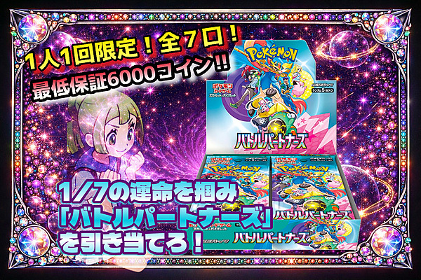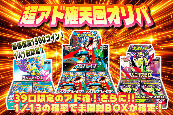 全てポケモンポケモン(BOX)ドラゴンボールワンピースホビーコラボその他 2026-02-15 23:59:59まで ラインナップ(一部)詳細11111111 無料/1回 1回ガチャ 2026-02-15 23:59:59まで ラインナップ(一部)詳細111111133333333 100/1回 1回ガチャ ラインナップ(一部)詳細223333 4000/1回 残1498 / 1500 1回ガチャ 10連ガチャ 100連ガチャ ラインナップ(一部)詳細525 600/1回 残3762 / 10000 1回ガチャ 10連ガチャ 100連ガチャ 2026-02-15 23:59:59まで ラインナップ(一部)詳細244466661212126612121212 83/1回 残39533 / 42746 1回ガチャ 10連ガチャ 100連ガチャ 2026-02-28 23:59:59まで ラインナップ(一部)詳細111111111111113355 17/1回 残73875 / 81920 1回ガチャ 10連ガチャ 100連ガチャ 2026-02-28 23:59:59まで ラインナップ(一部)詳細2222222222262755 88/1回 残15431 / 20735 1回ガチャ 10連ガチャ 100連ガチャ 2026-02-28 23:59:59まで ラインナップ(一部)詳細233113333333 80/1回 残9776 / 12760 1回ガチャ 10連ガチャ 100連ガチャ ラインナップ(一部)詳細10 194/1回 残1747 / 3190 1回ガチャ 10連ガチャ 100連ガチャ ラインナップ(一部)詳細10 7/1回 残69181 / 81920 1回ガチャ 10連ガチャ 100連ガチャ 2026-02-05 23:59:59まで 1300/1回 本ガチャは終了しました 2026-01-27 23:59:59まで 6500/1回 本ガチャは終了しました 2026-02-01 23:59:59まで 5400/1回 本ガチャは終了しました 2026-02-01 23:59:59まで 33/1回 本ガチャは終了しました 2026-01-26 23:59:59まで 777/1回 本ガチャは終了しました 2026-01-31 23:59:59まで 無料/1回 本ガチャは終了しました 2026-01-17 23:59:59まで 3000/1回 本ガチャは終了しました 700/1回 本ガチャは終了しました 1000/1回 本ガチャは終了しました 2026-02-01 23:59:59まで 52/1回 本ガチャは終了しました 2026-01-25 23:59:59まで 131/1回 本ガチャは終了しました 2026-02-01 23:59:59まで 119/1回 本ガチャは終了しました 5400/1回 本ガチャは終了しました 2026-01-25 23:59:59まで 110/1回 本ガチャは終了しました 2026-01-25 23:59:59まで 46/1回 本ガチャは終了しました 2026-01-05 23:59:59まで 65/1回 本ガチャは終了しました 2026-01-05 23:59:59まで 無料/1回 本ガチャは終了しました 2026-01-05 23:59:59まで 無料/1回 本ガチャは終了しました 2026-01-05 23:59:59まで 38/1回 本ガチャは終了しました 2025-12-31 23:59:59まで 76/1回 本ガチャは終了しました