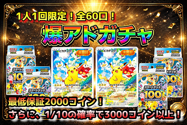 全てポケモンポケモン(BOX)ドラゴンボールワンピースホビーコラボその他 ラインナップ(一部)詳細24 1750/1回 残43 / 60 1回ガチャ ラインナップ(一部)詳細11111417237525 8999/1回 残100 / 100 1回ガチャ 2026-03-08 23:59:59まで ラインナップ(一部)詳細11111111 無料/1回 1回ガチャ 2026-03-08 23:59:59まで ラインナップ(一部)詳細111111133333333 100/1回 1回ガチャ ラインナップ(一部)詳細25551020 170/1回 残57594 / 59995 1回ガチャ 10連ガチャ 100連ガチャ 2026-03-01 23:59:59まで ラインナップ(一部)詳細2222222222262755 88/1回 残14424 / 20735 1回ガチャ 10連ガチャ 100連ガチャ 2026-03-01 23:59:59まで ラインナップ(一部)詳細233113333333 80/1回 残9680 / 12760 1回ガチャ 10連ガチャ 100連ガチャ 2026-02-28 23:59:59まで ラインナップ(一部)詳細244466661212126612121212 83/1回 残35643 / 42746 1回ガチャ 10連ガチャ 100連ガチャ ラインナップ(一部)詳細225555555556 66/1回 残29256 / 31900 1回ガチャ 10連ガチャ 100連ガチャ ラインナップ(一部)詳細525 590/1回 残17926 / 19800 1回ガチャ 10連ガチャ 100連ガチャ 2026-03-15 23:59:59まで ラインナップ(一部)詳細7 8/1回 残55909 / 57344 1回ガチャ 10連ガチャ 100連ガチャ 2026-03-15 23:59:59まで ラインナップ(一部)詳細7 10/1回 残56798 / 57344 1回ガチャ 10連ガチャ 100連ガチャ 2026-02-28 23:59:59まで ラインナップ(一部)詳細111111111111113355 17/1回 残48562 / 81920 1回ガチャ 10連ガチャ 100連ガチャ ラインナップ(一部)詳細50100150450 499/1回 残1317 / 1500 1回ガチャ 10連ガチャ 100連ガチャ ラインナップ(一部)詳細22396 2100/1回 残761 / 800 1回ガチャ 10連ガチャ 100連ガチャ 2026-02-28 23:59:59まで ラインナップ(一部)詳細11111111262403239 4800/1回 残584 / 600 1回ガチャ 10連ガチャ 100連ガチャ ラインナップ(一部)詳細1111111111111111111180 289/1回 残96998 / 100000 1回ガチャ 10連ガチャ 100連ガチャ ラインナップ(一部)詳細223333 4000/1回 残1410 / 1500 1回ガチャ 10連ガチャ 100連ガチャ ラインナップ(一部)詳細10 194/1回 残1670 / 3190 1回ガチャ 10連ガチャ 100連ガチャ ラインナップ(一部)詳細10 7/1回 残67674 / 81920 1回ガチャ 10連ガチャ 100連ガチャ ラインナップ(一部)詳細11101010 1502/1回 残199 / 320 1回ガチャ 10連ガチャ 100連ガチャ ラインナップ(一部)詳細50 2363/1回 残238 / 250 1回ガチャ 10連ガチャ 100連ガチャ ラインナップ(一部)詳細50 2363/1回 残198 / 250 1回ガチャ 10連ガチャ 100連ガチャ ラインナップ(一部)詳細50 2363/1回 残229 / 250 1回ガチャ 10連ガチャ 100連ガチャ 100/1回 本ガチャは終了しました 無料/1回 本ガチャは終了しました 2026-02-17 23:59:59まで 500/1回 本ガチャは終了しました 2026-02-05 23:59:59まで 1300/1回 本ガチャは終了しました 600/1回 本ガチャは終了しました 2026-02-09 23:59:59まで 205/1回 本ガチャは終了しました 2026-02-09 23:59:59まで 890/1回 本ガチャは終了しました 2026-01-27 23:59:59まで 6500/1回 本ガチャは終了しました 2026-02-01 23:59:59まで 5400/1回 本ガチャは終了しました 2026-02-01 23:59:59まで 33/1回 本ガチャは終了しました 2026-01-26 23:59:59まで 777/1回 本ガチャは終了しました 2026-01-31 23:59:59まで 無料/1回 本ガチャは終了しました 2026-02-01 23:59:59まで 52/1回 本ガチャは終了しました 2026-01-17 23:59:59まで 3000/1回 本ガチャは終了しました 2026-01-25 23:59:59まで 131/1回 本ガチャは終了しました 2026-02-01 23:59:59まで 119/1回 本ガチャは終了しました 700/1回 本ガチャは終了しました 1000/1回 本ガチャは終了しました 5400/1回 本ガチャは終了しました 2026-01-25 23:59:59まで 110/1回 本ガチャは終了しました 2026-01-25 23:59:59まで 46/1回 本ガチャは終了しました 2026-01-05 23:59:59まで 65/1回 本ガチャは終了しました 2026-01-05 23:59:59まで 無料/1回 本ガチャは終了しました 2026-01-05 23:59:59まで 無料/1回 本ガチャは終了しました 2026-01-05 23:59:59まで 38/1回 本ガチャは終了しました 2025-12-31 23:59:59まで 76/1回 本ガチャは終了しました