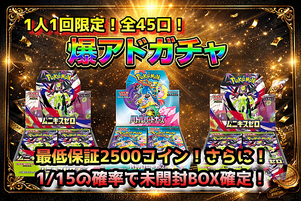 全てニブイチポケモンBOXドラゴンボールワンピースホビーコラボその他 2026-03-01 23:59:59まで ラインナップ(一部)詳細12 2380/1回 残17 / 45 1回ガチャ ラインナップ(一部)詳細52080 390/1回 残6968 / 7000 1回ガチャ 10連ガチャ 100連ガチャ ラインナップ(一部)詳細32770 61/1回 残14366 / 14440 1回ガチャ 10連ガチャ 100連ガチャ 2026-03-08 23:59:59まで ラインナップ(一部)詳細11111111 無料/1回 1回ガチャ 2026-03-08 23:59:59まで ラインナップ(一部)詳細111111133333333 100/1回 1回ガチャ ラインナップ(一部)詳細5520 10/1回 残2596 / 9570 1回ガチャ 10連ガチャ 100連ガチャ ラインナップ(一部)詳細2366 17/1回 残15949 / 16983 1回ガチャ 10連ガチャ 100連ガチャ ラインナップ(一部)詳細2222222222262755 88/1回 残14290 / 20735 1回ガチャ 10連ガチャ 100連ガチャ ラインナップ(一部)詳細233113333333 80/1回 残9603 / 12760 1回ガチャ 10連ガチャ 100連ガチャ ラインナップ(一部)詳細25551020 170/1回 残56719 / 59995 1回ガチャ 10連ガチャ 100連ガチャ ラインナップ(一部)詳細50100150450 499/1回 残1199 / 1500 1回ガチャ 10連ガチャ 100連ガチャ ラインナップ(一部)詳細22396 2100/1回 残745 / 800 1回ガチャ 10連ガチャ 100連ガチャ ラインナップ(一部)詳細1111111111111111111180 289/1回 残96749 / 100000 1回ガチャ 10連ガチャ 100連ガチャ ラインナップ(一部)詳細225555555556 66/1回 残29082 / 31900 1回ガチャ 10連ガチャ 100連ガチャ 2026-03-15 23:59:59まで ラインナップ(一部)詳細7 8/1回 残55416 / 57344 1回ガチャ 10連ガチャ 100連ガチャ 2026-03-15 23:59:59まで ラインナップ(一部)詳細7 10/1回 残56521 / 57344 1回ガチャ 10連ガチャ 100連ガチャ ラインナップ(一部)詳細525 590/1回 残17908 / 19800 1回ガチャ 10連ガチャ 100連ガチャ ラインナップ(一部)詳細10 194/1回 残1660 / 3190 1回ガチャ 10連ガチャ 100連ガチャ ラインナップ(一部)詳細10 7/1回 残67492 / 81920 1回ガチャ 10連ガチャ 100連ガチャ 2026-03-08 23:59:59まで ラインナップ(一部)詳細11111417237525 8999/1回 残99 / 100 1回ガチャ 2026-03-08 23:59:59まで ラインナップ(一部)詳細223333 4000/1回 残1407 / 1500 1回ガチャ 10連ガチャ 100連ガチャ 2026-03-31 23:59:59まで ラインナップ(一部)詳細11101010 1502/1回 残199 / 320 1回ガチャ 10連ガチャ 100連ガチャ 2026-03-31 23:59:59まで ラインナップ(一部)詳細50 2363/1回 残229 / 250 1回ガチャ 10連ガチャ 100連ガチャ 2026-02-23 23:59:59まで 1750/1回 本ガチャは終了しました 2026-02-27 23:59:59まで 4800/1回 本ガチャは終了しました 5/1回 本ガチャは終了しました 83/1回 本ガチャは終了しました 2026-02-28 23:59:59まで 17/1回 本ガチャは終了しました 2026-02-28 23:59:59まで 4800/1回 本ガチャは終了しました 2026-02-28 23:59:59まで 2363/1回 本ガチャは終了しました 2026-02-28 23:59:59まで 2363/1回 本ガチャは終了しました 100/1回 本ガチャは終了しました 無料/1回 本ガチャは終了しました 2026-02-17 23:59:59まで 500/1回 本ガチャは終了しました 2026-02-05 23:59:59まで 1300/1回 本ガチャは終了しました 600/1回 本ガチャは終了しました 2026-02-09 23:59:59まで 205/1回 本ガチャは終了しました 2026-02-09 23:59:59まで 890/1回 本ガチャは終了しました 2026-01-27 23:59:59まで 6500/1回 本ガチャは終了しました 2026-02-01 23:59:59まで 5400/1回 本ガチャは終了しました 2026-02-01 23:59:59まで 33/1回 本ガチャは終了しました 2026-01-26 23:59:59まで 777/1回 本ガチャは終了しました 2026-01-31 23:59:59まで 無料/1回 本ガチャは終了しました 2026-02-01 23:59:59まで 52/1回 本ガチャは終了しました 2026-01-17 23:59:59まで 3000/1回 本ガチャは終了しました 2026-01-25 23:59:59まで 131/1回 本ガチャは終了しました 2026-02-01 23:59:59まで 119/1回 本ガチャは終了しました 700/1回 本ガチャは終了しました 1000/1回 本ガチャは終了しました 5400/1回 本ガチャは終了しました 2026-01-25 23:59:59まで 110/1回 本ガチャは終了しました 2026-01-25 23:59:59まで 46/1回 本ガチャは終了しました 2026-01-05 23:59:59まで 65/1回 本ガチャは終了しました 2026-01-05 23:59:59まで 無料/1回 本ガチャは終了しました 2026-01-05 23:59:59まで 無料/1回 本ガチャは終了しました 2026-01-05 23:59:59まで 38/1回 本ガチャは終了しました 2025-12-31 23:59:59まで 76/1回 本ガチャは終了しました
