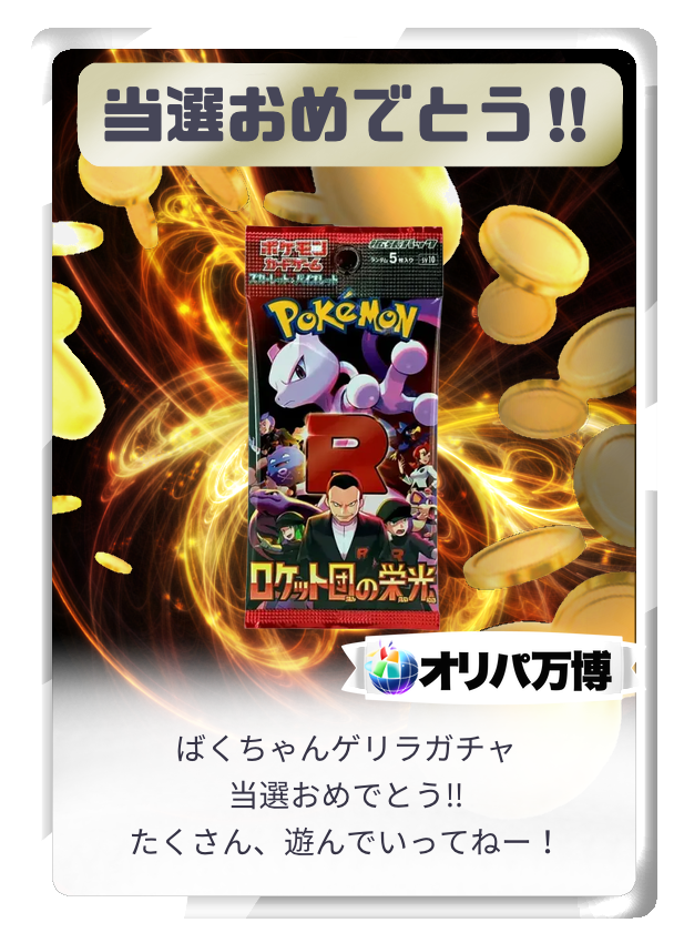 オリパには、傷や汚れがあるカードが含まれる場合がございます。商品画像はあくまでイメージであり、実際のカードの状態や排出内容を保証するものではありません。掲載されていないカードも排出される可能性があります。