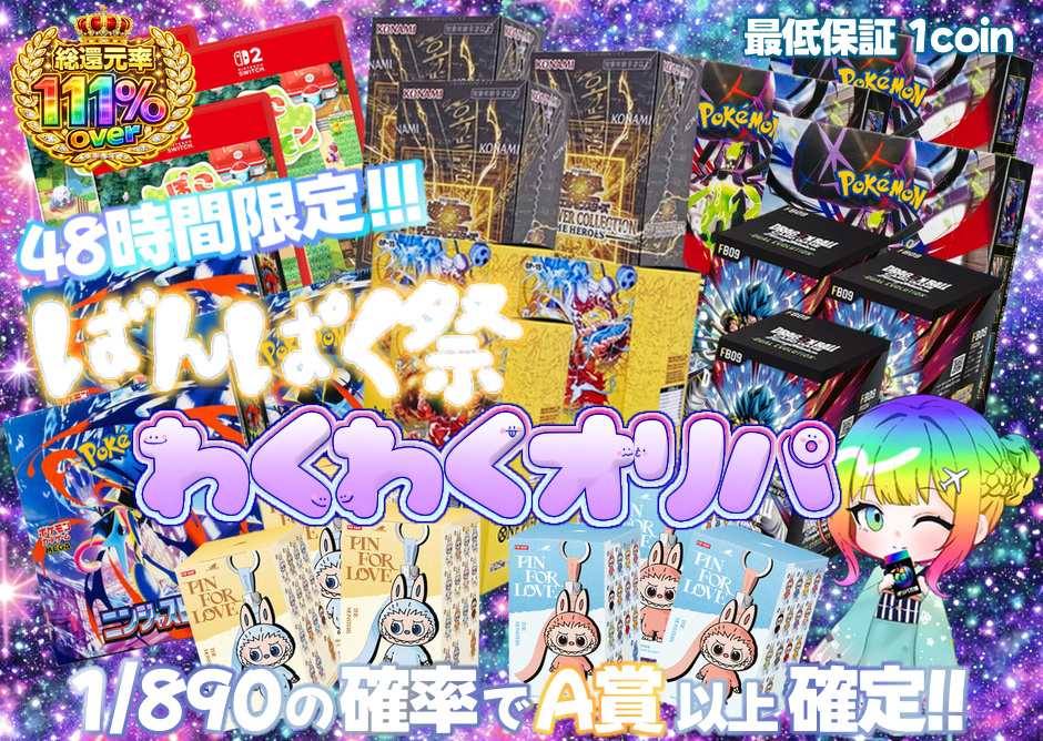 還元率はオリパをすべて購入した場合の理論値に基づき算出しておりますが、個々の抽選結果によって得られるカードの設定コイン額はランダムであり、すべての抽選で1口あたりの同等額を保証するものではありません。また、仕様上、商品に対する交換・返金はお受けできません。