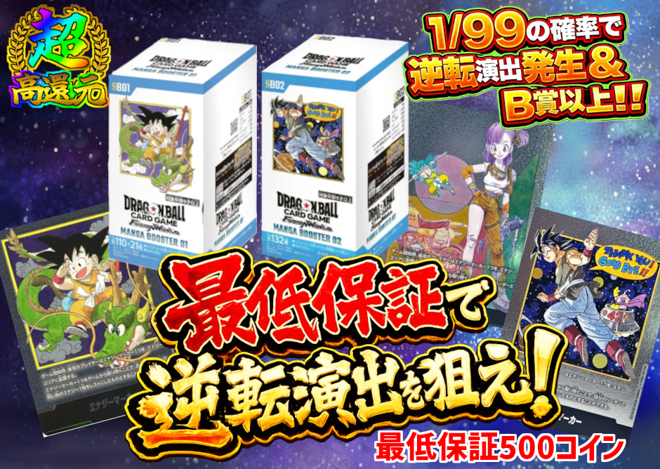 還元率はオリパをすべて購入した場合の理論値に基づき算出しておりますが、個々の抽選結果によって得られるカードの設定コイン額はランダムであり、すべての抽選で1口あたりの同等額を保証するものではありません。また、仕様上、商品に対する交換・返金はお受けできません。
